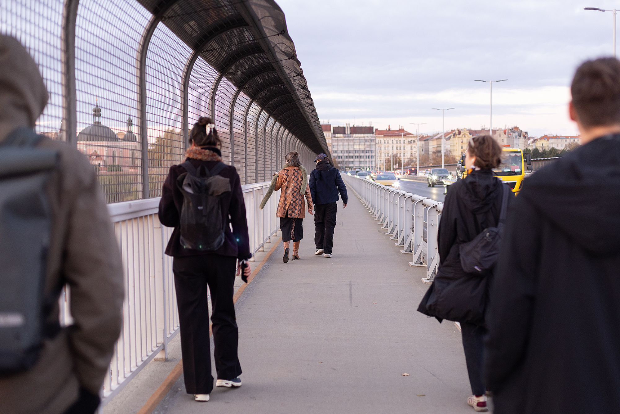 An immersive audio walk and performance set around Vyšehrad metro station and Nusle Bridge gradually reveals the secrets, legends, and identity of this space through the speculative fiction of the fairy cloak. The Nusle Valley, with its iconic bridge, becomes the stage for a performative shared experience and imagination that blends historical and fictional narratives, weaving together reality and myth. What do we discover when we view the space through the eyes of a tourist and follow a romantic date unfolding in this vulnerable environment?