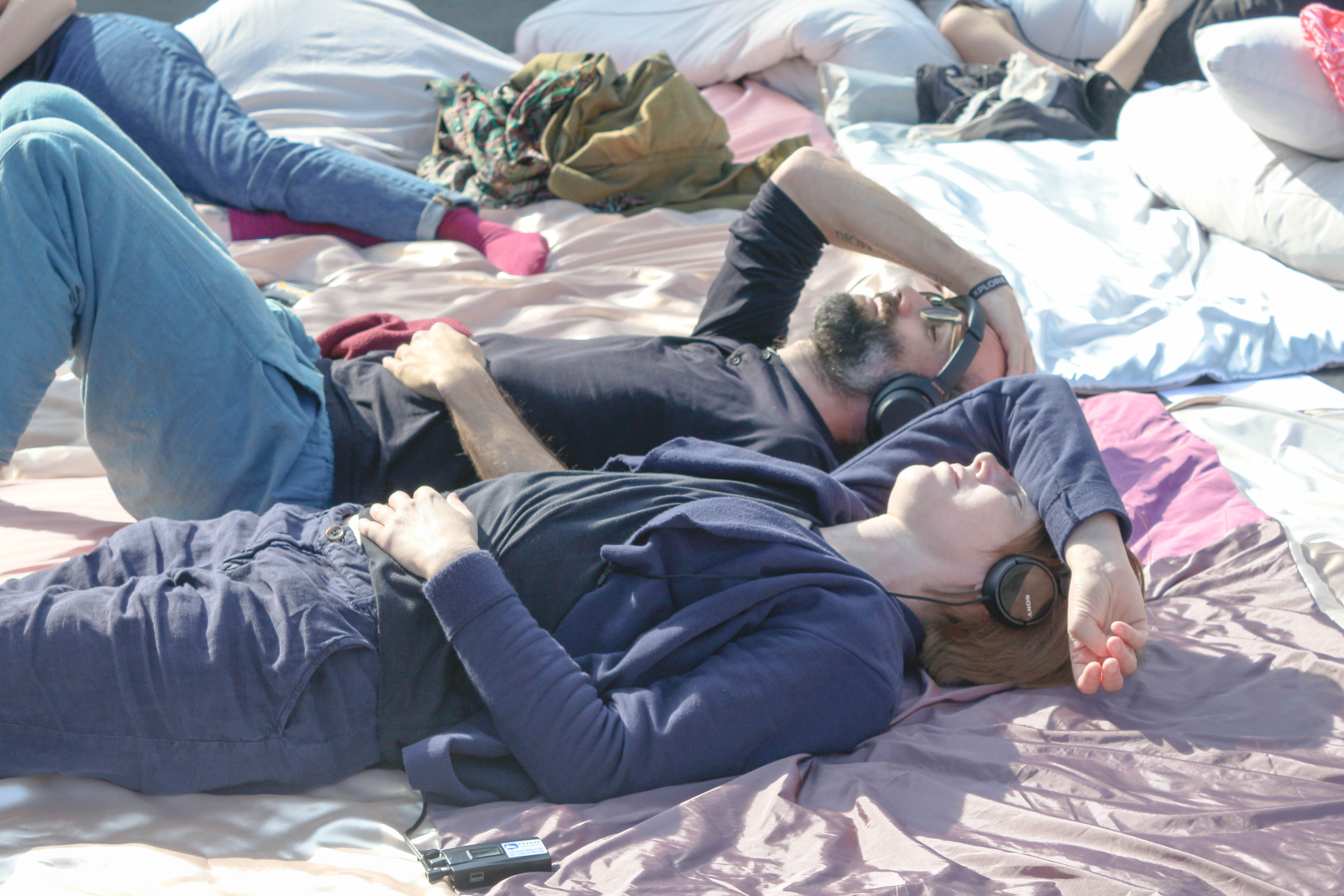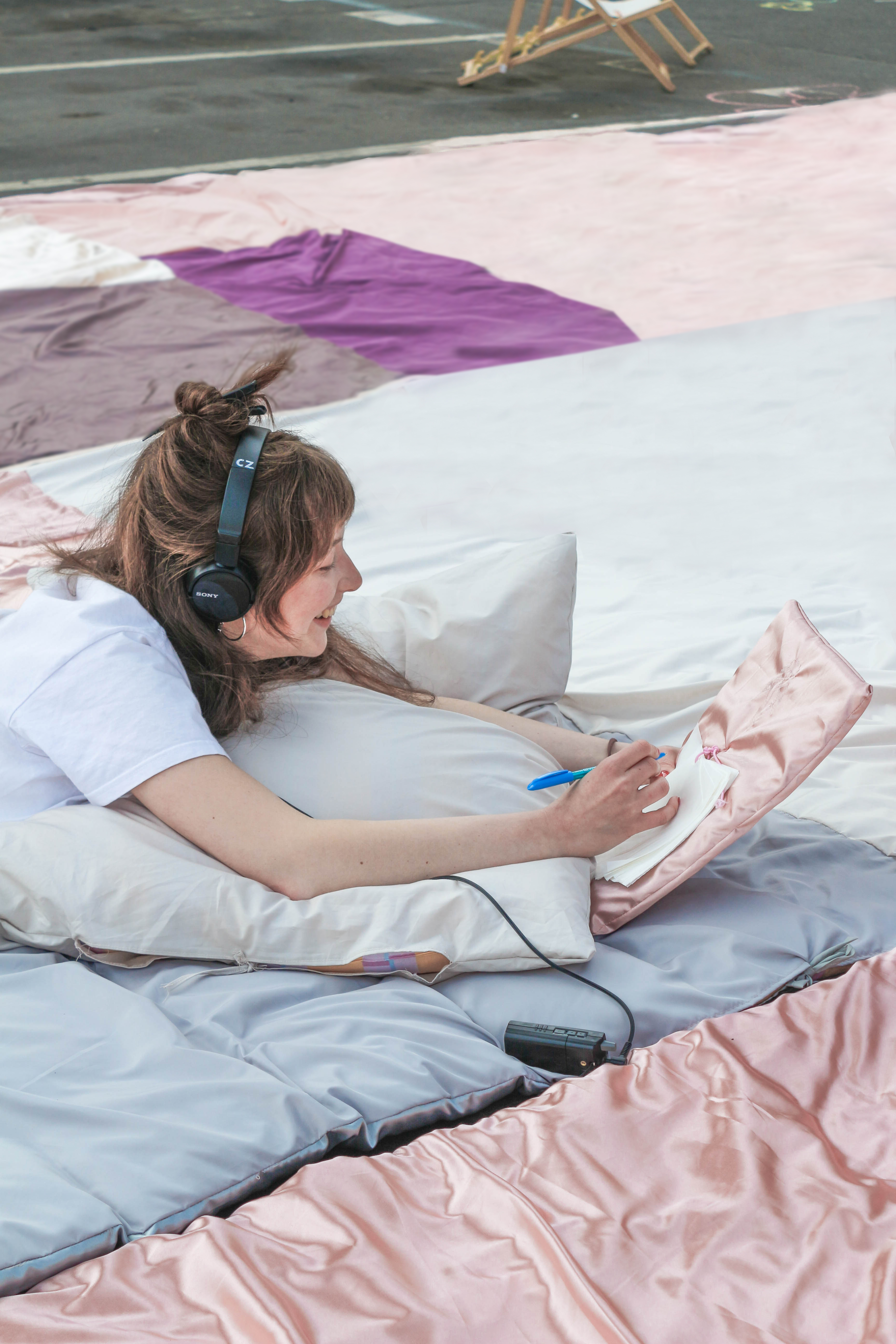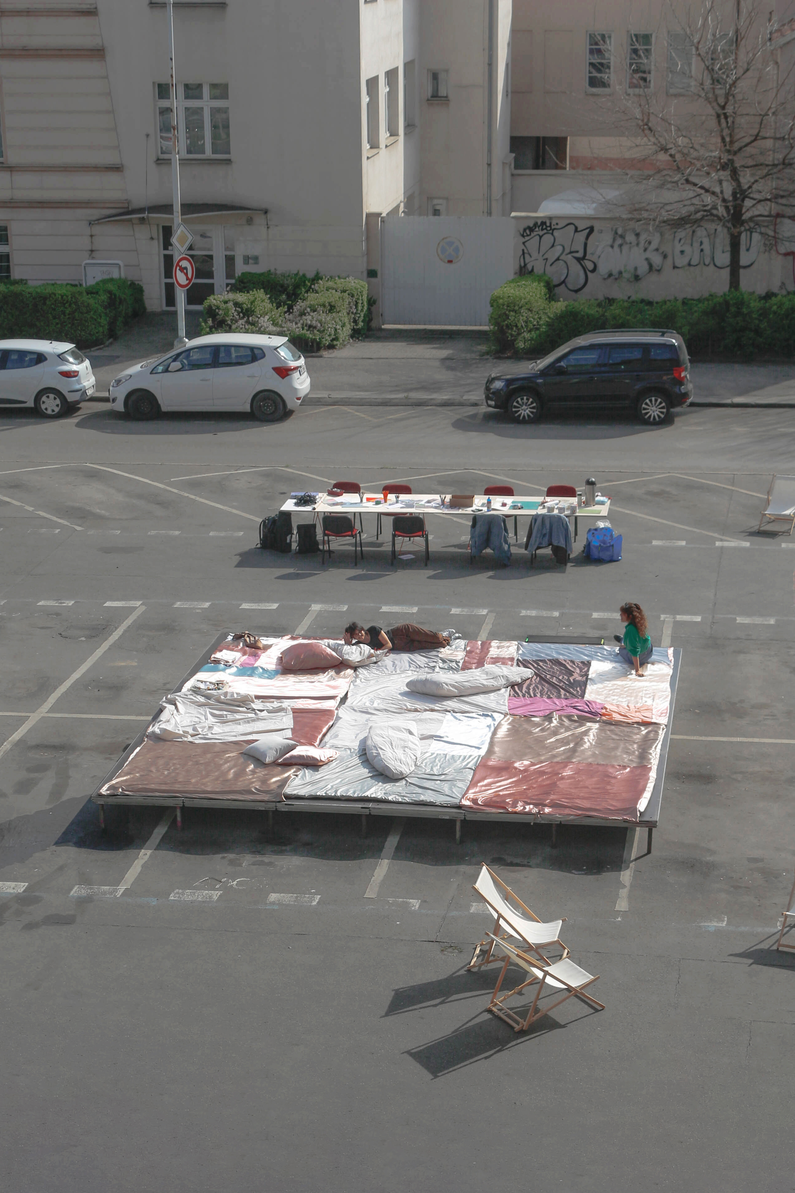 For one day, a parking lot hidden under Nusle Bridge, at the corner of Oldřichova and Svatoplukova streets, was transformed into a public space for collective dreaming and listening. The textile installation, together with an audio story and sound,invited passersby and inhabitants to slow down, lie down, and listen — to the space, to themselves, and to the subtle voices of what usually remains unheard.