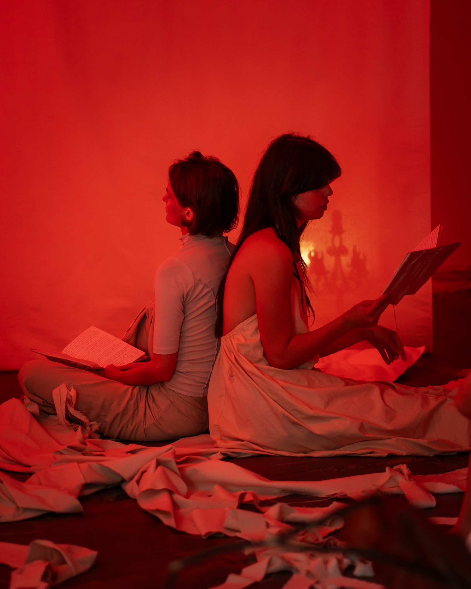 The performance was part of artist Tereza Melková's exhibition "𝒲𝒽𝑒𝓃 𝐼 𝓉𝒽𝒾𝓃𝓀 𝓌𝒾𝓉𝒽 𝓂𝓎 𝒽𝒶𝓃𝒹𝓈, 𝐼 𝓉𝒽𝒾𝓃𝓀 𝓈𝓁𝑜𝓌𝓁𝓎" which she created during her residency in Petrohradská collective. Together we created a story about sewing, stitching, and knitting that focuses on healing, thinking slowly, regeneration, and vulnerability in connection with nature. While we were performing and reading the story, we stitched and knitted broken parts of our bodies with the audience, trying to restore dry, dead plant roots. The forest and its roots are metaphors for mutual support, care, and slow healing. We read fairytales where characters transform themselves into plants or trees - not as an escape or surrender, but as an act of emancipation and finding freedom and stability in connection with nature and ourselves.